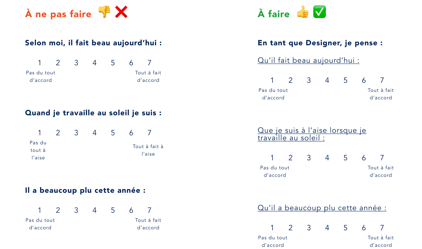 Nous avons fait attention à choisir correctement nos mesures en fonction de nos objectifs (voir section suivante) : dans l'exemple de gauche, le dernier item correspond à une mesure objective : il aurait donc fallu proposer un format de réponse en oui/non. Dans l'exemple de droite, nous souhaitions évaluer le ressenti des participants (= mesure subjective) : nous avons donc gardé le format de réponse sous forme d'échelle de Likert mais nous avons reformulé l'item ('je pense qu'il a beaucoup plu cette année') afin qu'il corresponde réellement à notre objectif.