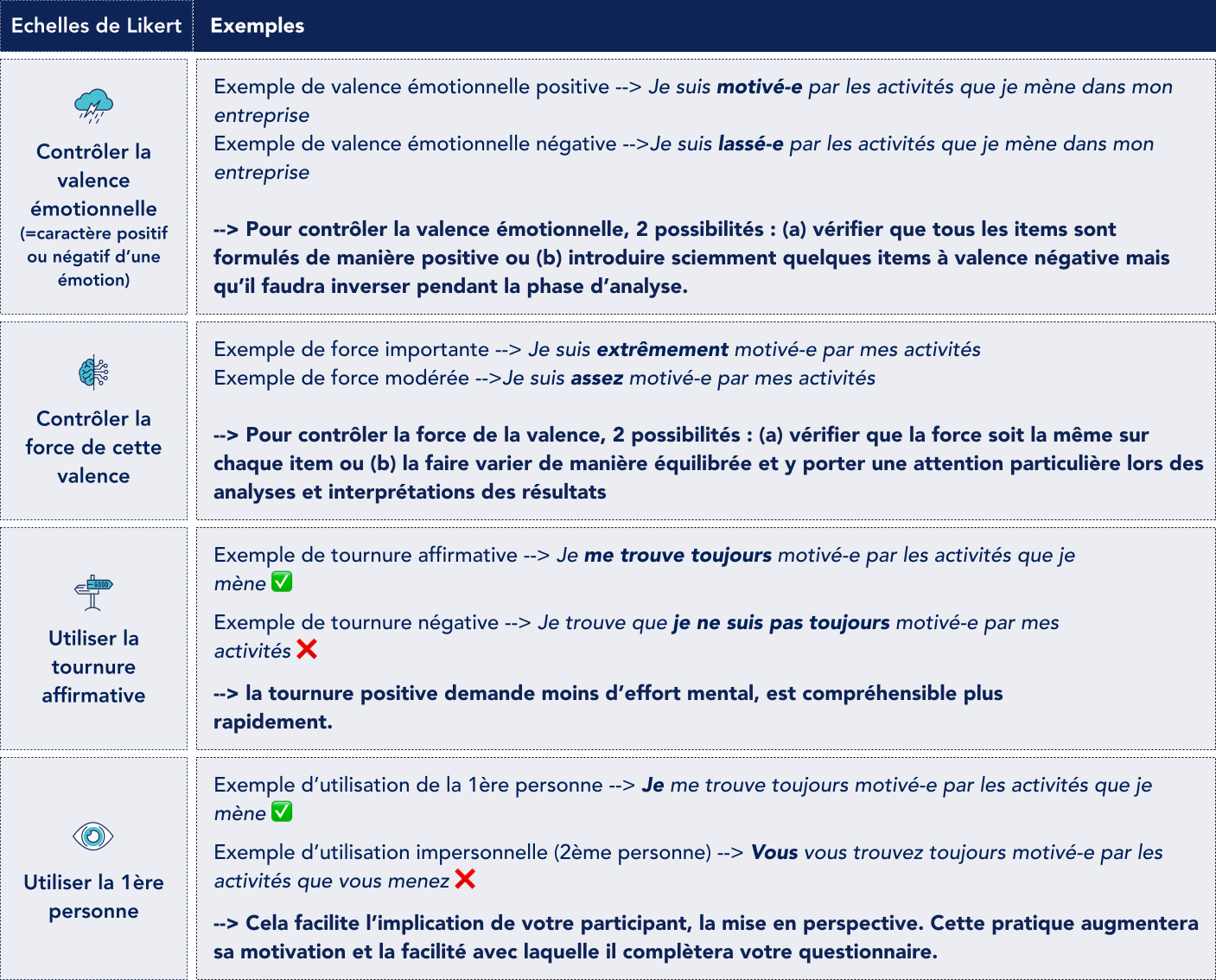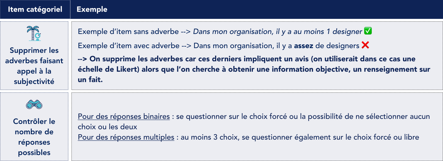 Avant tout : vous devez proposer des items nécessaires et utiles - autrement dit, uniquement des items qui vont servir l'objectif et répondre à la thématique ou sous-thématique - à laquelle ils appartiennent. Faites donc attention à ne pas surcharger vos thématiques d’items dont vous ne vous servirez pas ou qui ne seront pas réellement pertinents et représentatifs de ce que vous cherchez à mesurer.