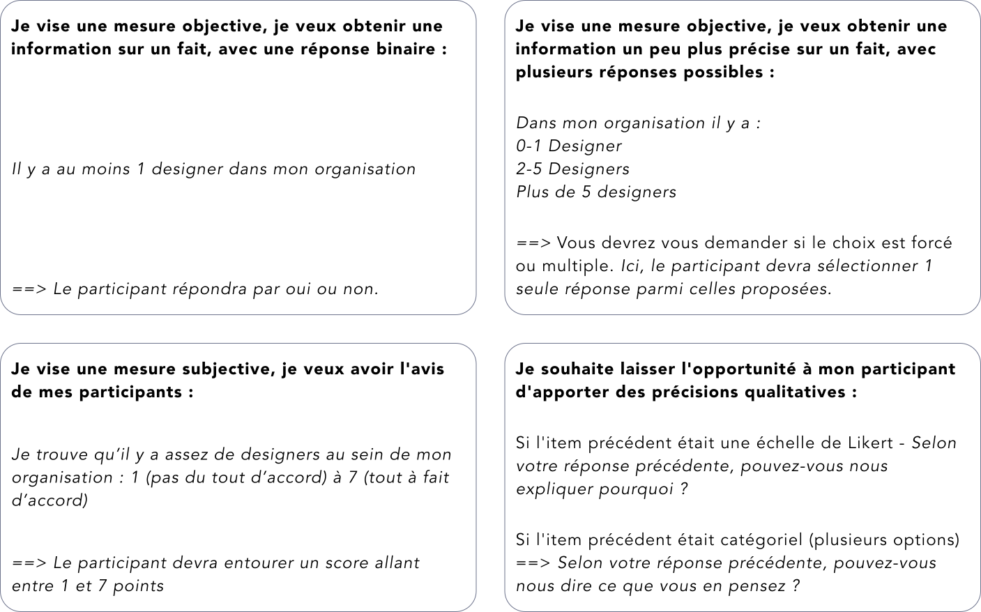 Si mes objectifs s'y prêtent, j'essaye de varier entre questions en oui/non, échelles de Likert (ex : de 1 pas du tout d'accord à 7 tout à fait d'accord), questions ouvertes, questions à choix multiples...