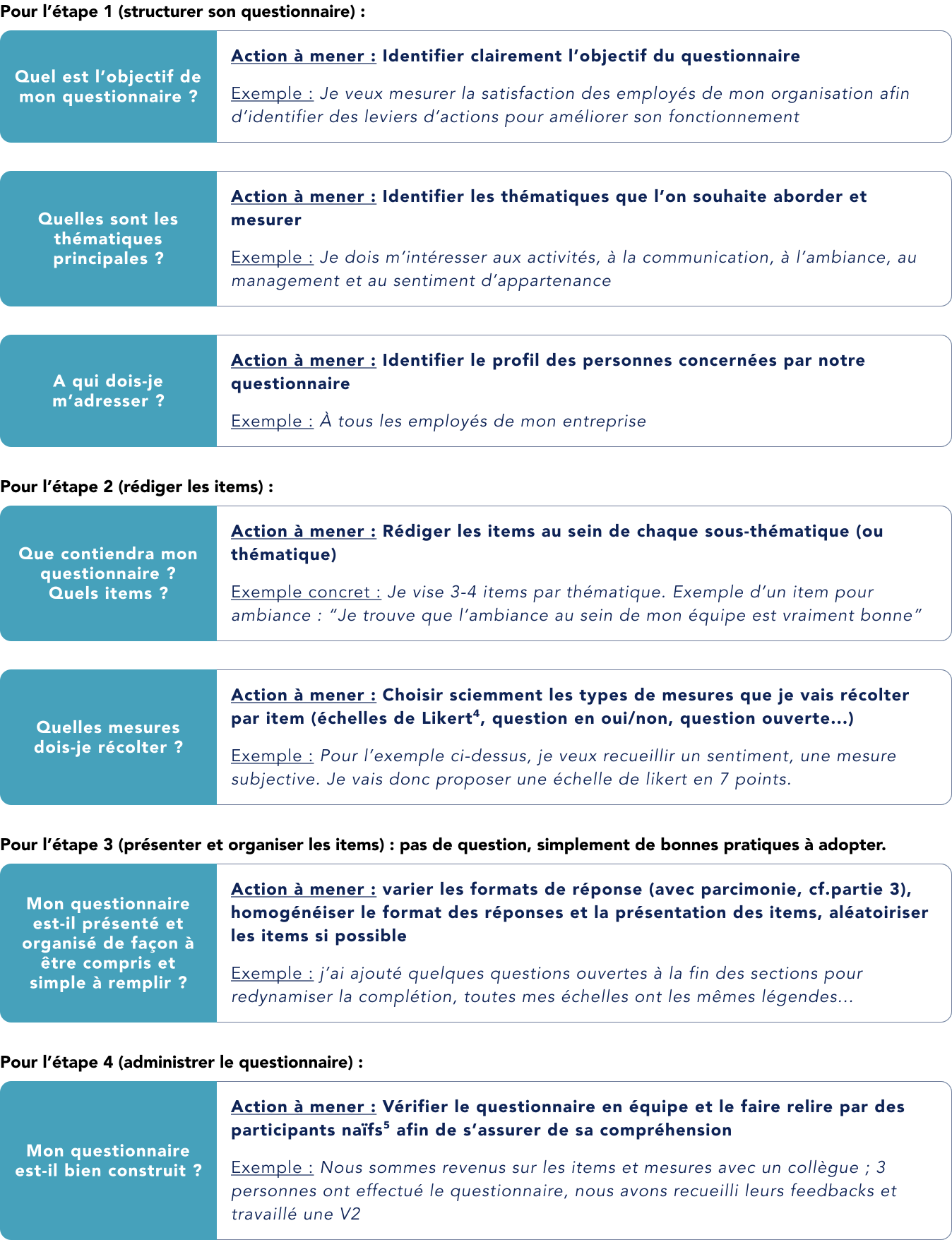 Il est fortement recommandé de construire le questionnaire en équipe. Une co-construction durant chaque étape (formulation de l’objectif, identification des thématiques à aborder, rédaction des items) permettra en effet d’éviter les biais.