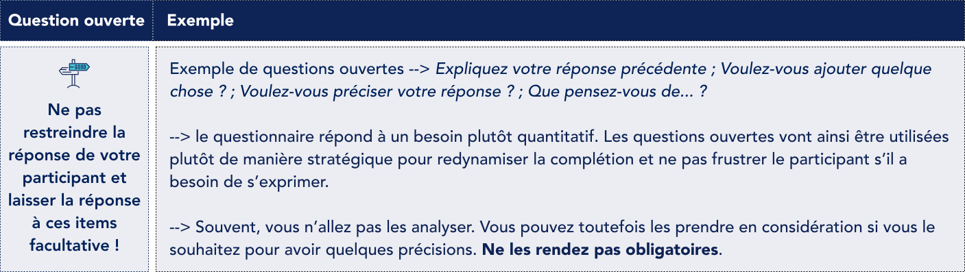Si mon questionnaire comporte 40 échelles à remplir par exemple, je peux couper tous les 10 items par une question ouverte. Cela évite de fatiguer mon participant ou de le pousser à répondre par automatisme (i.e., qu'il ne lise plus vraiment mes items). Cette méthode permet de redynamiser la complétion du questionnaire.