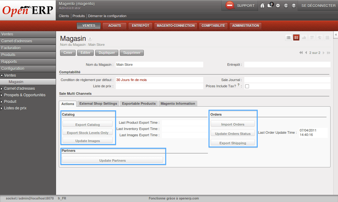 La version utilisée d'OpenERP et dernière à savoir la 6.0.2 (Il existe une version du module pour la v5 d'OpenERP mais l'effort de développement est concentré sur la v6). Il faut installer le module magentoerpconnect disponible à l'adresse suivante : https://launchpad.net/magentoerpconnect ou directement en utilisant bazaar :
