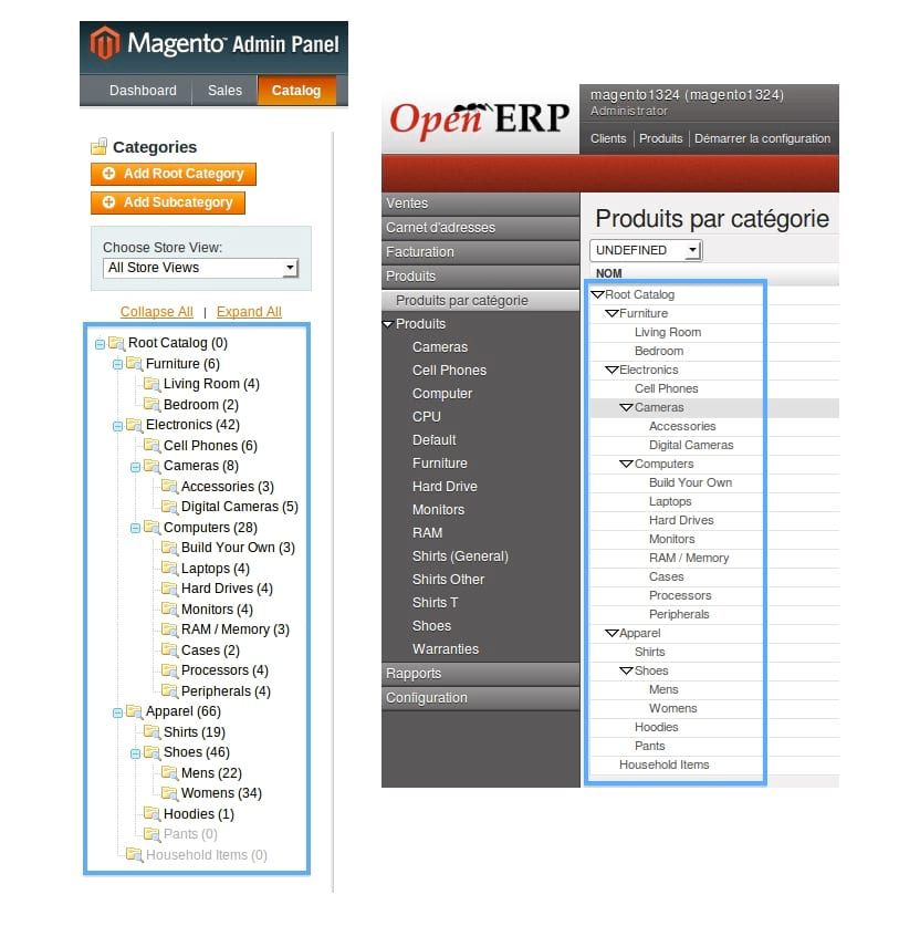 - (Optionnel) Il est possible d'effectuer l'import initial des Partners, Partner Categories, Products, Product Categories,... L'import initial des catégories de produit à partir d'une base de démo Magento donne bien la même hiérarchie comme le montre la figure suivante :