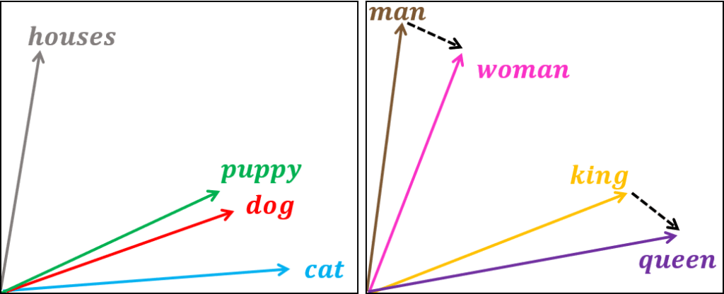 Cela consiste à construire une représentation vectorielle des mots telle que les vecteurs représentant les mots conservent certaines des relations que les mots ont entre eux. Les vecteurs sont des objets mathématiques, à l’instar des nombres, qui peuvent être exploités par l’ordinateur. En particulier, on peut les comparer et voir si le vecteur associé au mot 1 est plus ou moins loin du vecteur associé au mot 2. C’est intéressant si les mots au sens proche ont des vecteurs associés proches également.