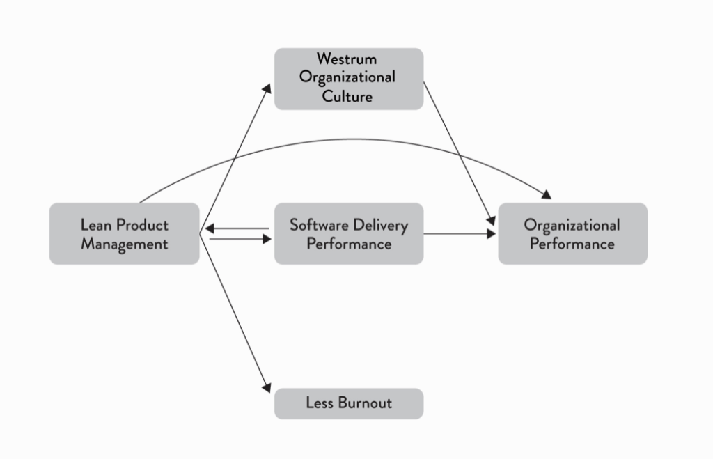 De la même façon, implémenter le lean product management permet d'améliorer son delivery. En effet, ces pratiques ont un impact positif sur la performance de delivery et sont plutôt liées à des cultures génératives au sens de Westrum et à moins de burnouts dans l’organisation .