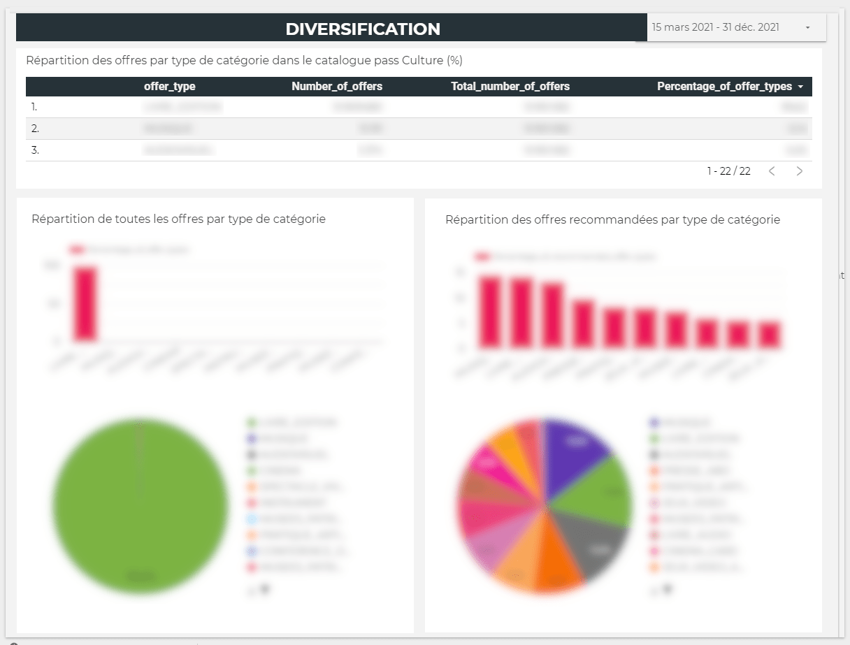 Exemple de dashboards pour l’algorithme de recommandation du pass Culture (les données ont été cachées par des rectangles bleus par souci de confidentialité)