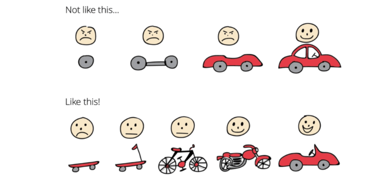 Pour illustrer cette démarche, prenons un cas d’usage où le besoin métier est de créer un moyen de locomotion. Il serait pertinent de d’abord développer un skateboard. Le besoin de se déplacer est comblé, le skateboard est rapide à construire et apporte déjà de la valeur. On itèrera ensuite afin d’améliorer ce premier moyen de locomotion. Et si, après avoir mis dans la main de nos premiers utilisateurs ce skate, le principal retour que nous avons est “J’adore la sensation de la brise dans mes cheveux, mais j’aimerais aller plus vite”, on a là une bonne indication concernant la construction de notre voiture : elle sera décapotable !