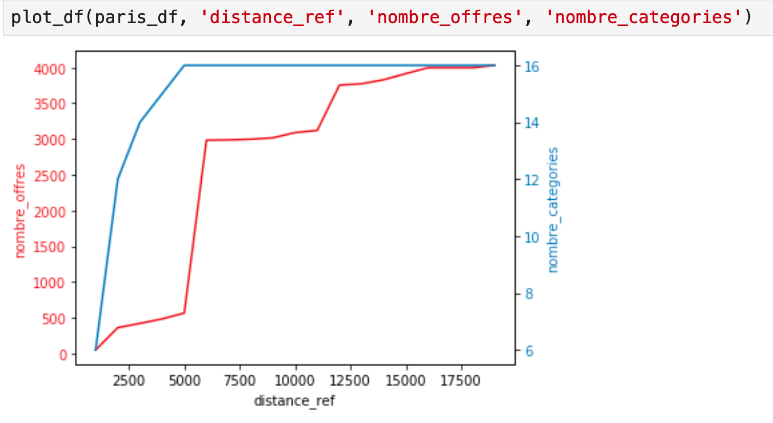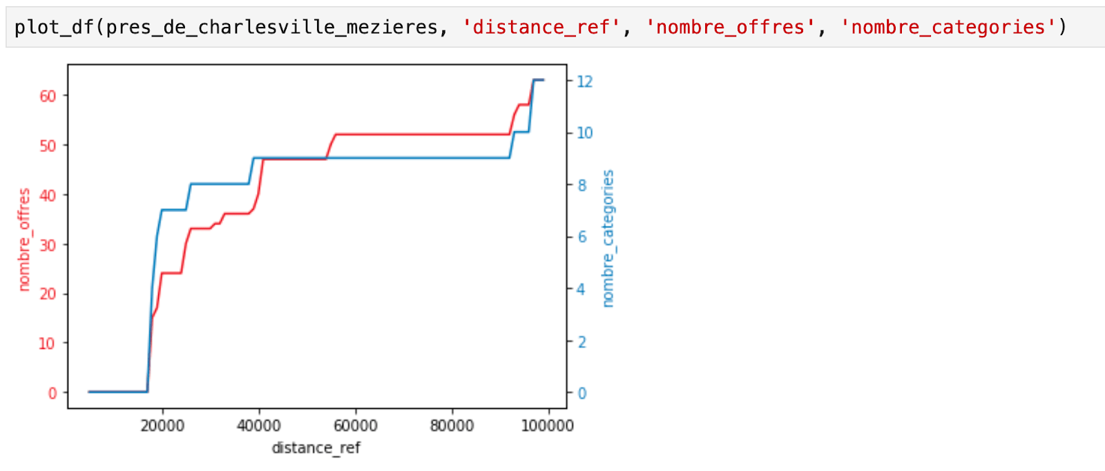 Exemple de graphiques représentant le nombre d’offres et le nombre de catégories en ordonnées et la distance en abscisses pour des points de localisation basés à Paris et à Charleville-Mézières.