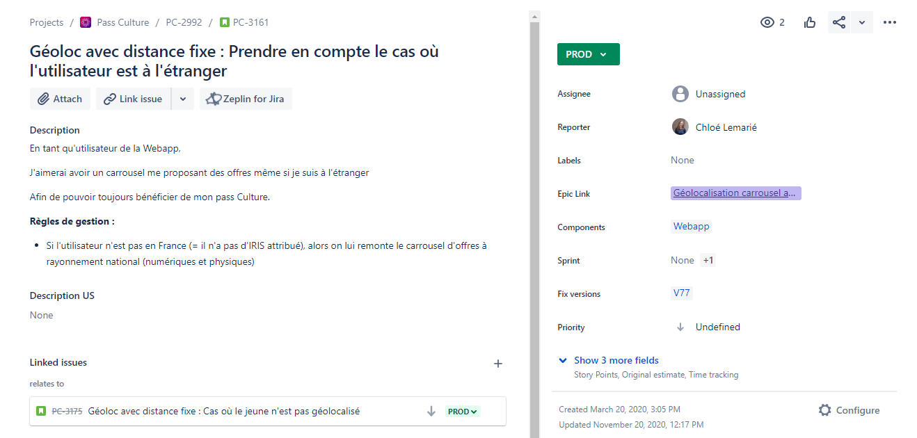 En reprenant l'exemple du pass Culture et de la géolocalisation, on peut par exemple initier un découpage en traitant chaque type de situation. Nous avons ainsi d’abord priorisé une user story pour traiter le cas passant d’un utilisateur géolocalisé en France, puis traité séparément les cas d’utilisateurs non géolocalisés, ou localisés à l’étranger.