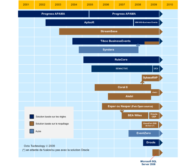 Le schéma suivant trace l’évolution des solutions du marché (inspiré d'un post de Paul Vincent sur le blog Tibco et mis à jour):