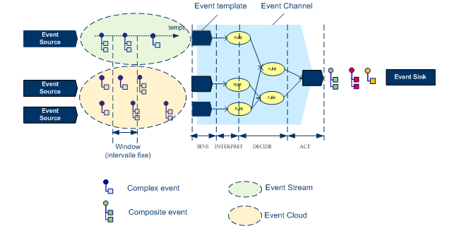 Composite event (un événement composé): un événement construit par combinaison de plusieurs événements utilisant des constructeurs d’événements particuliers, comme une conjonction, disjonction, etc.