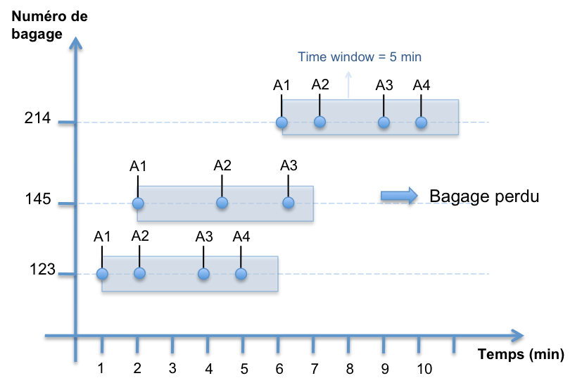 Prenons le scénario suivant : En partant du postulat que chaque bagage, une fois enregistré, porte une puce RFID que des antennes sont capables de localiser. Les antennes transmettent les messages à une application « centrale » avec les bagages qu’elles ont identifiés dans leur périmètre. Pour détecter les problèmes nous considérons que le temps maximum d’un « voyage » sur le tapis est de n secondes, et, qu’au delà de ce délai, le bagage doit être considéré comme manquant. La méthode consiste donc à vérifier qu’un même bagage est passé par les 4 antennes dans l’intervalle de temps attendu et donc, qu’il existe 4 évènements détectés pour un même bagage dans les n dernières secondes.