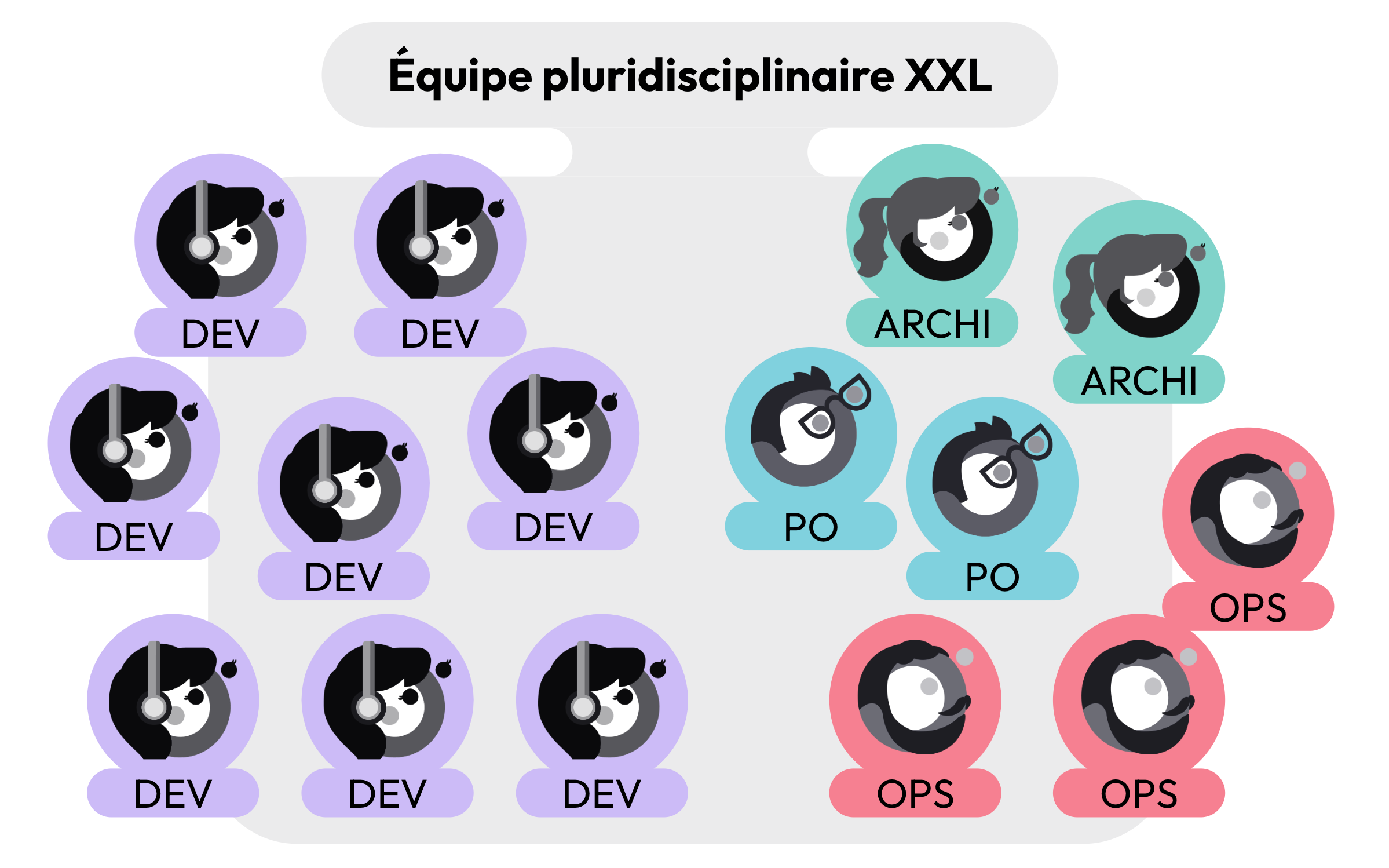 Une équipe pluridisciplinaire, composée d'un PO, d'Ops, d'un Archi et de Devs