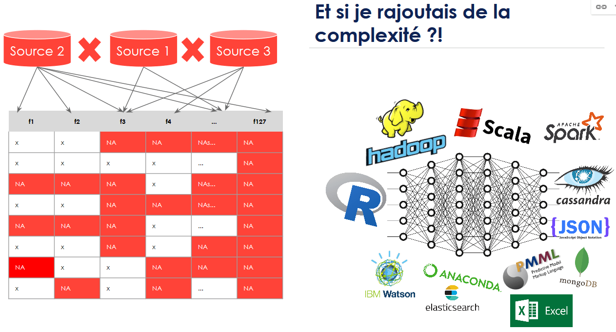 Si j’ai une source de données dont la fréquence est à la journée et une autre qui est trimestrielle, comment les agréger ? Quid des NA ? Très souvent, ce qu’on observe chez nos clients, c’est qu’au lieu de traiter les problèmes un à un, on se rajoute de la complexité (“Tiens, et si je partais sur un CNN multi-layers dans un écosystème Hadoop, le tout en bash ?”)