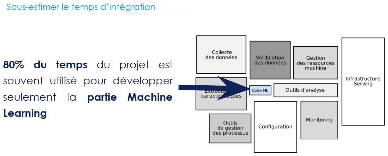 La top priorité est de brancher le modèle le plus rapidement possible aux différents flux de production quitte à favoriser la compréhension du modèle au détriment de sa performance, car il est impossible d’anticiper les problèmes, en l’occurrence ceux liés à la donnée. Plus vite on s’intègre au SI, mieux on anticipera les coûts d’intégration. Souvent ce qu’on observe est que 80 % du temps est utilisé pour développer la partie machine learning au détriment de l’intégration. On se retrouve à faire 80 % supplémentaires consacrés à l’intégration !
