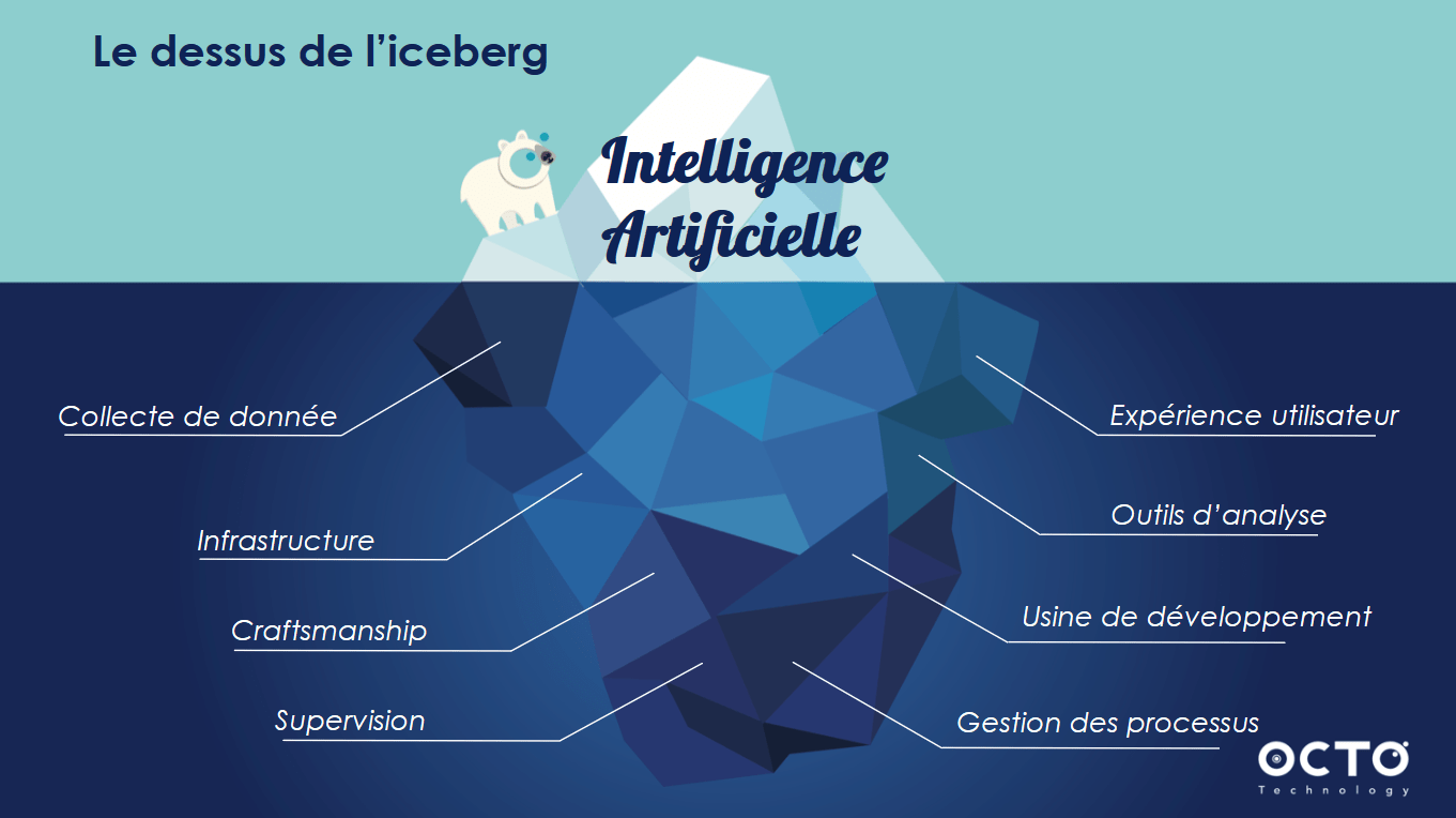 Très souvent, quand on parle d’IA on ne pense qu’à son cas d’utilisation (qui n’est que le dessus de l’iceberg) et on néglige sa face cachée ainsi que tout le lot de complexité avec lequel elle vient. Et c’est au moment de l’intégration dans le SI qu’on se rend compte de sa complexité, mais il est déjà trop tard.