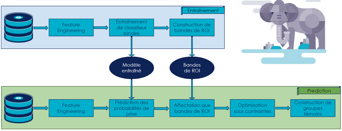 Le premier retour d'expérience concerne l'optimisation d'une campagne marketing dont l'objectif était de déterminer quel client démarcher et sur quel canal pour optimiser le ROI de sollicitation. Pour ce faire, on a utilisé une modélisation uplift (qui se trouve avoir été utilisée lors de la campagne d'Obama en 2008) en exploitant une métrique propre à ce type de use case : l'AUUC (Area Under Uplift Curve). De même qu'un éléphant se mange par petites bouchées, la solution finale (cf. schéma) s'est construite de façon itérative sur quatre POCs, en rencontrant le métier à chaque POC le plutôt possible pour valider conjointement les KPIs et optimiser le modèle. Chaque POC a été mis en production et testé en conditions réelles (en Espagne). Une fois que les performances du système manuel (déjà en place) ont été surpassées, le déploiement à travers le monde a pu débuter : Bulgarie, Brésil, etc., tout en tenant comptes des spécificités locales.
