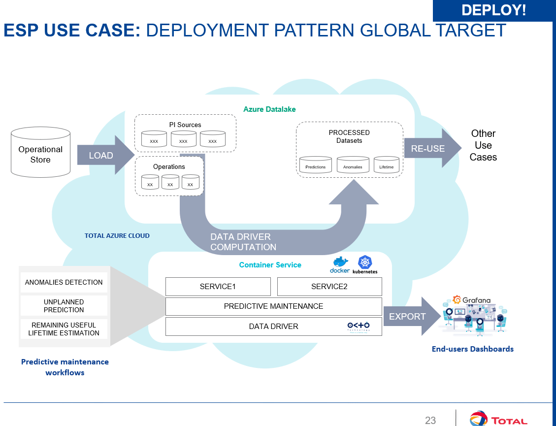 Le POC du projet a été effectué pour un premier pays (10 ESP, une centaine de modèles par puits) en utilisant des données de capteurs. Après plusieurs itérations, des résultats intéressants ont été produits et s'en est suivi la question du passage à l'échelle pour déployer sur plusieurs pays. En effet, passer à 3 pays implique une centaine d'ESP, ce qui implique le déploiement de milliers de modèles. Comment gérer cette complexité en production, le tout en agilité ? Comment garantir la reproductibilité entre l’exploration et la production ? Ce "scaling" a été rendu possible par l'adoption de Data Driver dès le POC, notamment grâce à la richesse de son socle technique, ses capacités de scheduling et de monitoring de workflow ainsi que l'intégration naturelle de Docker dans un environnement du Cloud Azure comme en témoigne l'architecture cible ci-dessous :