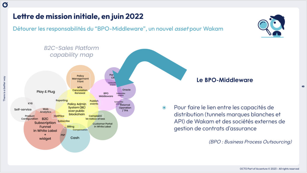 Initialement, en juin 2022, cet accompagnement portait sur le cadrage du BPO-Middleware : un nouvel asset permettant à Wakam de faire le lien entre leur capacité de distribution (tunnels en marques blanches et APIs) et des sociétés externes de gestion de contrats d’assurance appelées des BPO (pour Business Process Outsourcing) afin d’améliorer le time to market.