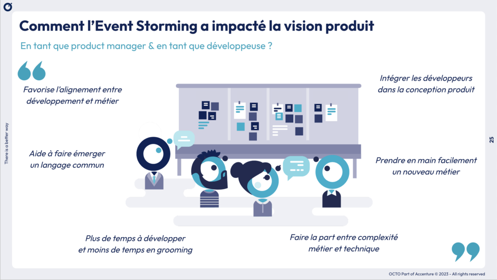 Pour sa part, Sofia Calcagno, experte DDD et développeuse, retient que le DDD en général et l’Event Storming en particulier ont permis d’accélérer la compréhension du métier par les développeurs, qui n’avaient pas forcément déjà travaillé dans le monde de l’assurance. Cela a également permis de les intégrer dans la conception du produit et ainsi diminuer le nombre d’aller-retours entre les développeurs et le métier pour clarifier les sujets. Enfin, le DDD a permis de faire la part entre la complexité métier et la complexité technique, qui était particulièrement importante dans le cadre d’OCPAS.