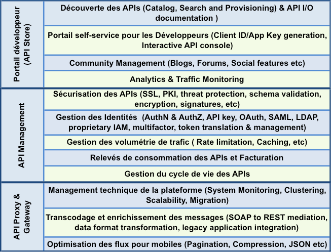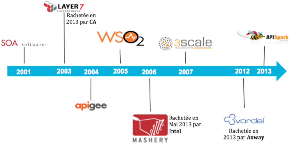 Les solutions, apparues autour de 2005, se sont d’abord distinguées par leurs portails, qui permettent aux développeurs tiers de découvrir les APIs proposées, d’accéder à la documentation, à des services sociaux autour des APIs et d’obtenir les APIs Key pour pouvoir commencer à utiliser les APIs proposées. À ces “pure players” se sont greffées des solutions orientées “SOA Gouvernance” qui existait bien avant, tels SOA Software et Layer7. On a donc assisté, sur la dernière décennie, à une fusion des marchés de la SOA avec celui de l’API Management. D’ailleurs le Gartner identifie le marché des “Application Services Management” comme étant la somme des offres de SOA Gouvernance et de l’API Management.