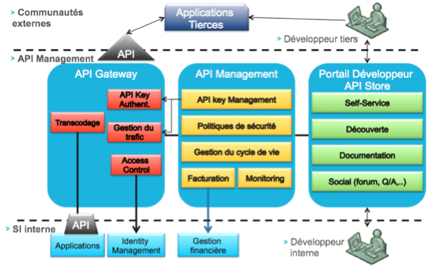 On peut ainsi représenter l’architecture fonctionnelle des solutions d’API Management de la façon suivante :