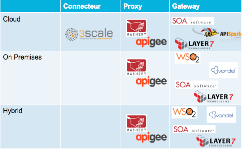 Enfin les solutions d’API Management, à l’image de l’ensemble des services applicatifs actuels, proposent des modes de delivery différents : Cloud, On Premises, voire Hybrides. Nous avons croisé dans le tableau ci-après les principales offres selon le critère de l'architecture technique et du mode de delivery :
