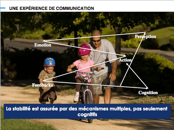 Une expérience Pour mieux comprendre, Alexis Nicolas invite les participants à poser la pulpe de l’index sur le genou. Le doigt est calé, à sa place défini : nous sommes alors dans la stabilité. Mais si nous commençons à caresser légèrement la surface du genou... Des sensations naissent, des informations se créer, et nous appréhendons ce même index de façon différente. Nous ouvrons un champ de possibilités que l’index statique ne pouvait pas nous laisser imaginer.