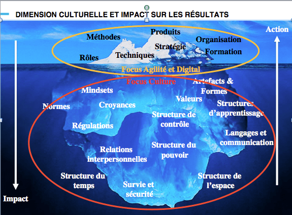 Nos plans d’action et de changement se concentrent trop souvent sur ce qui est visible (agilité, digital). Or, les forces de stabilité se situent dans la partie immergée de l’iceberg.