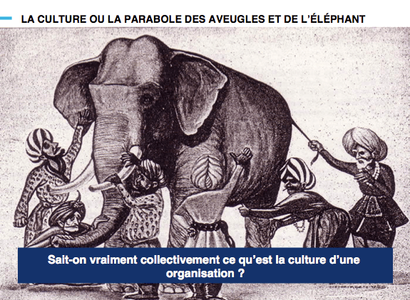 Entre nous s’engagent des échanges passionnants sur ce qu’est ou peut apporter la culture agile-digitale (leadership, droit à l’erreur, autonomie, simplicité, etc.) Mais nous n’avons pas le langage nécessaire pour en parler. Cette situation n’est pas sans rappeler la parabole des aveugles et de l’éléphant : tout le monde devise sur le sujet, mais il n’y a pas de vision partagée.