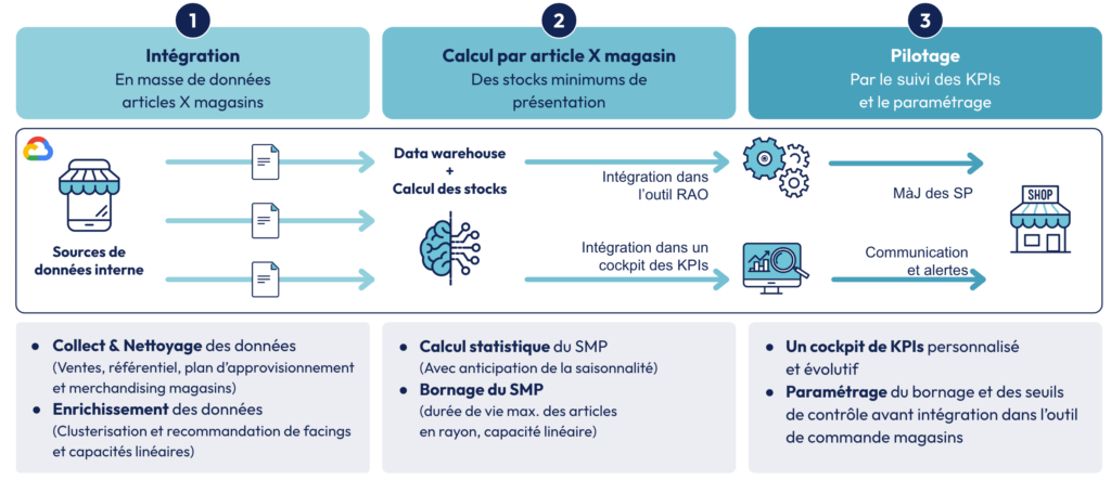 1. INTEGRATION, en masse de données articles X magasins avec la collecte et le nettoyage des données (ventes, référentiel, plan d’approvisionnement et merchandising magasins) et l**’enrichissement** des données (clusterisation et recommandation de facings et capacités linéaires). La clusterisation a un rôle clé dans le déploiement, elle a permis un déploiement rapide en capitalisant sur les collectes réalisées par certains magasins pour permettre une extrapolation à d’autres et en environ 10 mois avoir près de 80% du parc magasins déployés.