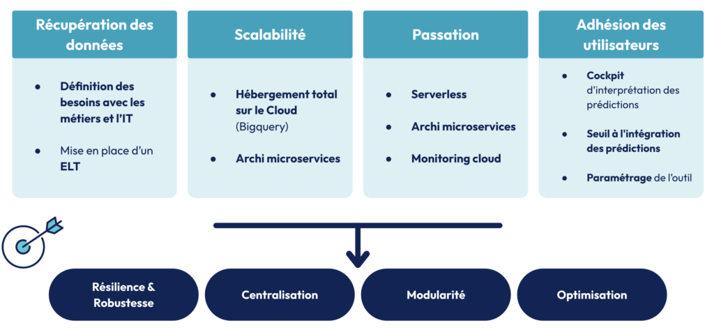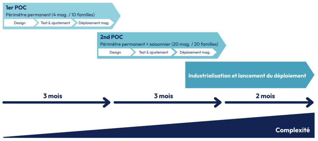 Nous avons donc mené un projet sur 8 mois, avec une approche progressive, dont une première phase de design et un premier POC après environ 2 mois sur un périmètre de produits (10 familles) et de magasins (4) considérés comme permanent. En parallèle, nous avons continué le développement de nouvelles fonctionnalités pour le lancement d’un 2nd POC vers le 4ème mois sur 14 familles et 20 magasins , avant le déploiement de la solution et la mise en place du mode de fonctionnement après 8 mois.