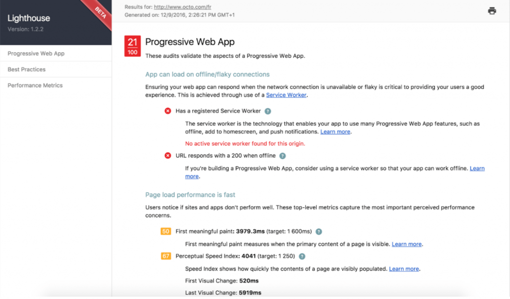 Au delà de donner un score, Lighthouse analyse point par point les caractéristiques du site testé. On retrouve des choses simples comme “est on en HTTPS”, “y’a t’il un service worker”, “y’a t’il un app manifest”, “est ce qu’on répond en hors-ligne” à des choses plutôt liées aux performances web en général “First meaningful paint”, “Time To Interactive”...