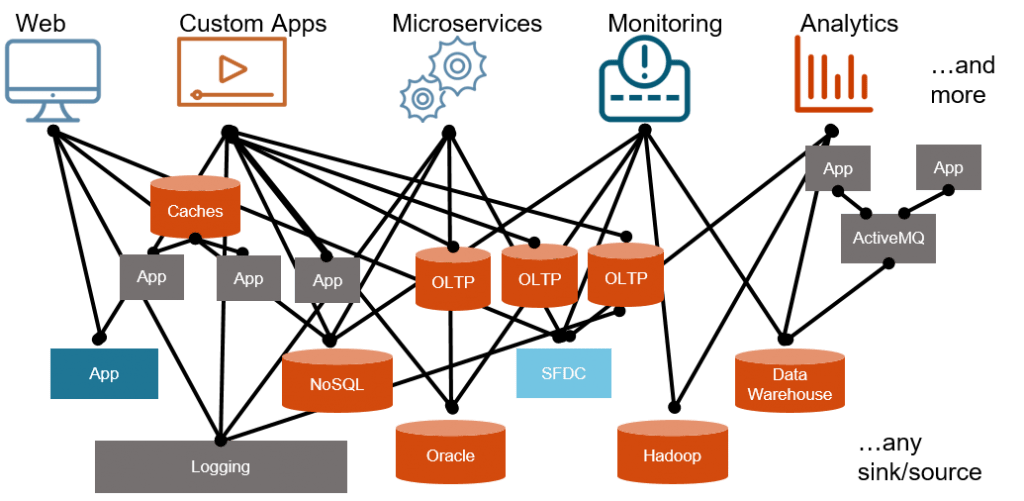 As depicted by Jay Krepps (Confluent CEO and Kafka Co-founder) in his article series dated from 2015 (part 1 and part 2), most companies information systems architecture look like this: