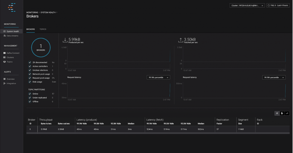 All set! You now have one Zookeeper node, one Kafka broker and Control centre running. You should see 1 broker available and a bunch of metrics about it in the bottom part of the screen in Control Center.