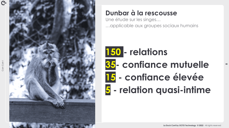 - Les nombres de Dunbar : au-delà d’un certain nombre de personnes (5), l’efficacité d’une équipe décroît rapidement.