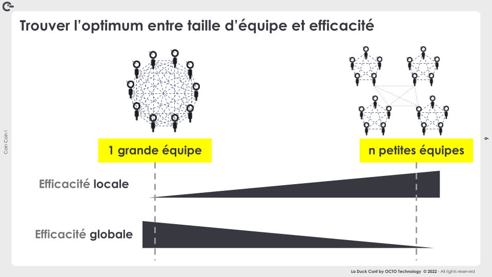 - L’équilibre entre efficacité locale (au sein de chaque équipe) et globale (entre plusieurs équipes) : en fonction du type de domaine, choisir où doit être porté l’efficacité locale (petites équipes réactives et véloces) et où l’efficacité globale doit primer (plus larges équipes mutualisant des ressources).