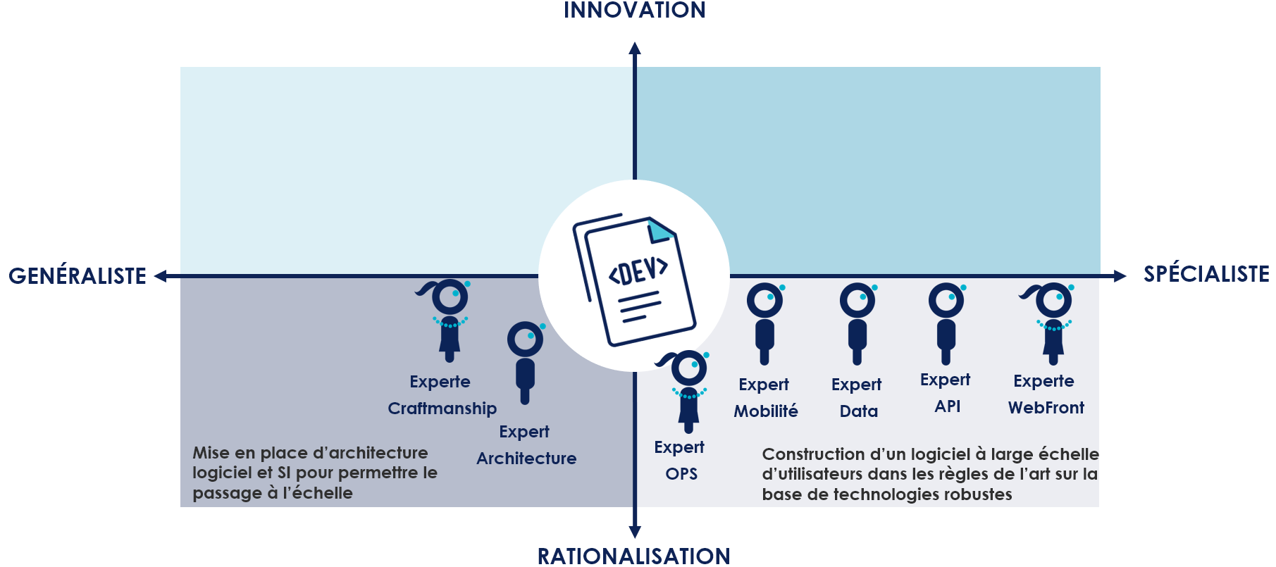 - Les profils séniors sont cruciaux pour construire un logiciel à large échelle d’utilisateurs et éviter les chausse-trappes. Pour faciliter un passage à l’échelle des profils référents Ops ou Craft peuvent venir compléter le dispositif.