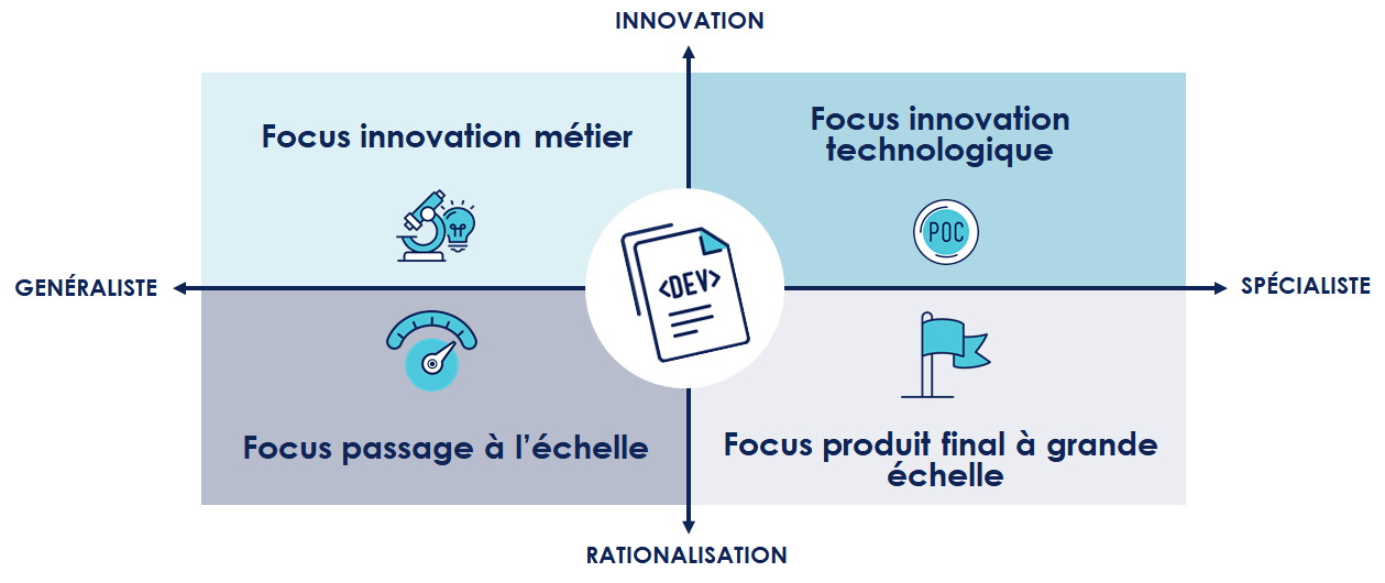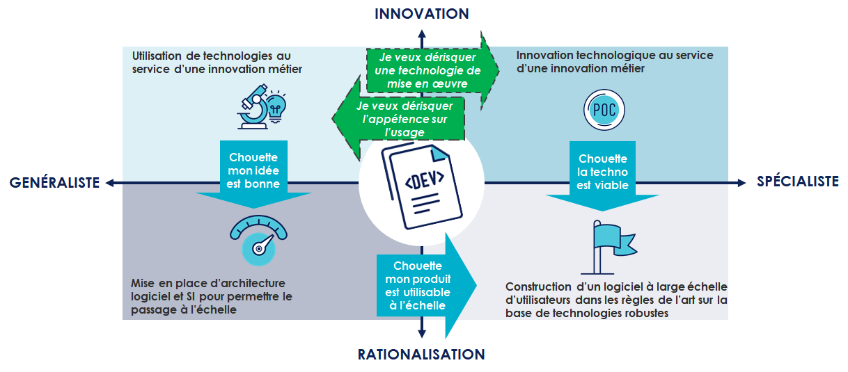 - Notez que dans la zone d’innovation métier (“focus innovation métier”) il est nécessaire d’être en pleine conscience que les solutions produites sont potentiellement imparfaites techniquement, jetables et que la plupart du temps, elles ne passent pas à l’échelle.