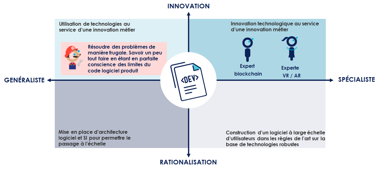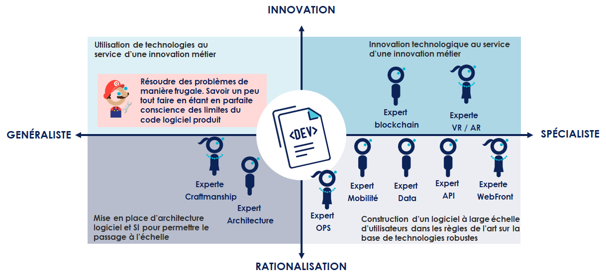 - Sur l’axe des abscisses, on positionne les types de compétences, plutôt généralistes à gauche et spécialistes à droite.