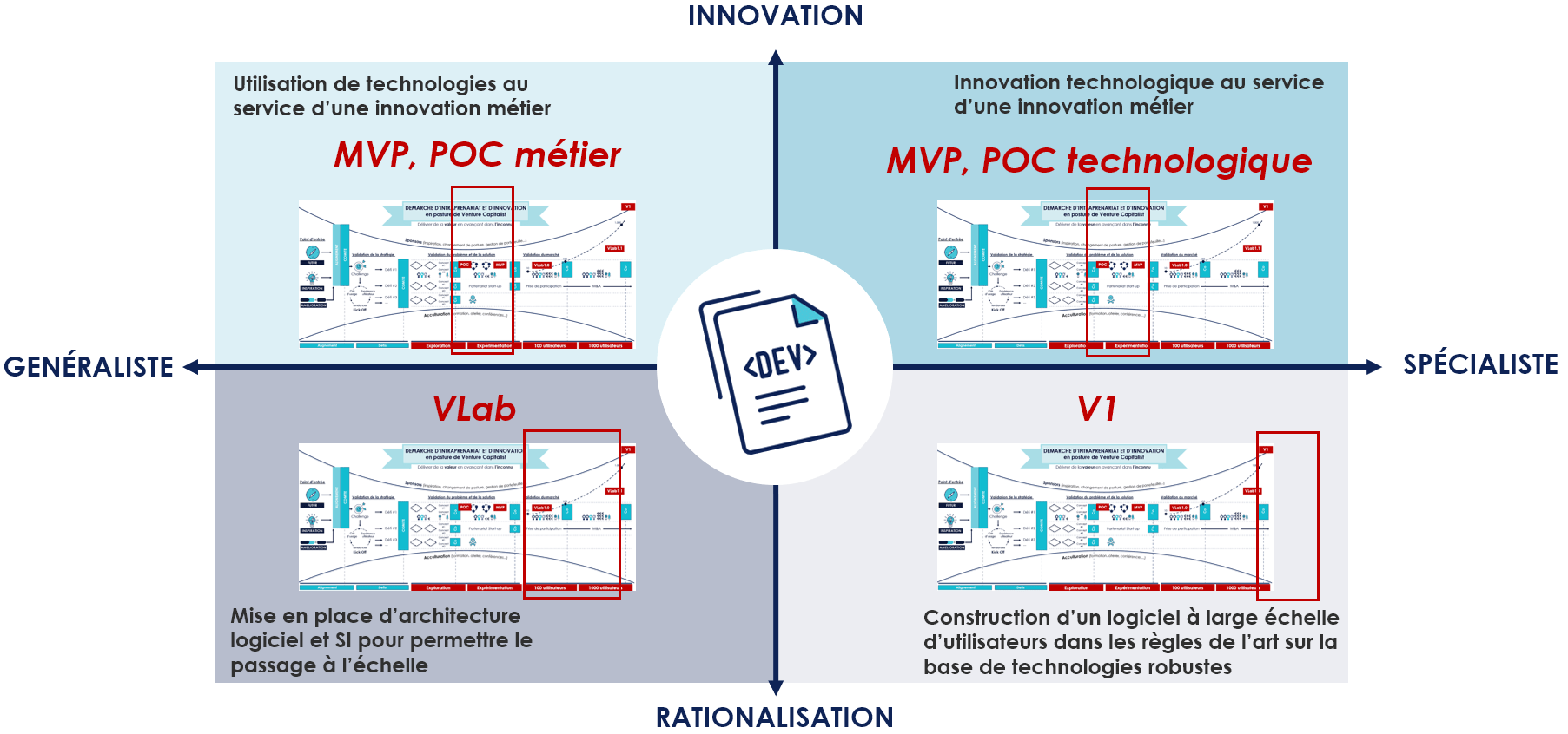 - Focus innovation métier : Si l’on cherche davantage à valider une innovation métier, on cherchera plutôt à utiliser des technologies disponibles sur étagères (ou avec un coût d’intégration modeste) pour tester le produit/service métier dans un MVP jetable. L’objectif est bien alors de dé-risquer l’usage (auprès d’une population réduite d’utilisateurs) et non la technique qui le sert. Dans ce cas et pour optimiser les ressources, il sera plus efficace de s’appuyer sur des profils moins techniques mais suffisamment “débrouillards” pour assembler des outils et progiciels (SaaS par exemple) permettant de rendre le service attendu et construire une solution jetable (“MVP ou MVP ?”) Si et seulement si la traction est au rendez-vous alors on pourra envisager une refonte via un développement logiciel dans les règles de l’art. Et nous revoilà dans la zone de rationalisation.