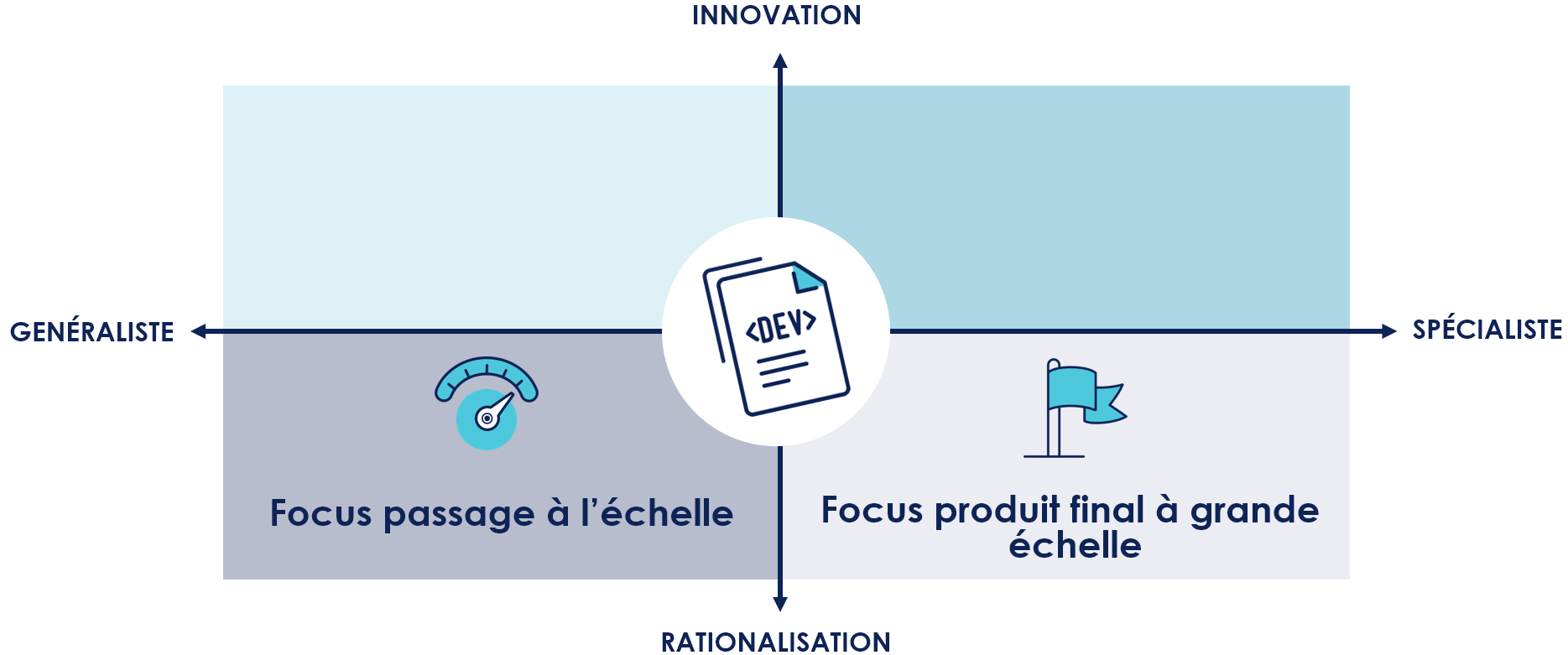 Revenons à la problématique des compétences RH et de leur rareté / coût. Dans la partie innovation, on peut certes avoir besoin d’un expert technique (un spécialiste) sur une compétence étroite. Il sera bien entendu rare et cher mais faire appel à lui ou elle ne se fera que de manière ponctuelle (en une fois ou au fil de l’eau). L’objectif est qu’il soit un accélérateur pour les équipes dont on parlait au départ et qui seront par la suite en charge du développement produit/service dans la zone rationalisation.