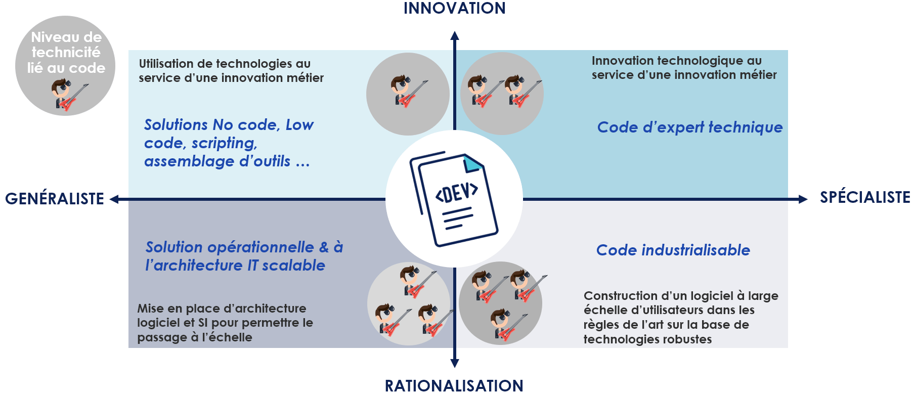 Dans la zone d’innovation métier (en haut à gauche), on s’appuie en particulier sur des outils, technologies ou progiciels dont la technicité de mise en place est moins exigeante en termes de compétences IT. Ils permettent ainsi à des personnes plus transverses et proches des enjeux métiers (moins familières du développement informatique) de mettre en place et à moindre coût des tests d’usages de leurs innovations. Notamment, sur la base de solutions de type SaaS, “No code”, “Low code”, qui une fois assemblées permettent de tester “dans la vraie vie” son innovation produit ou service. C’est une véritable chance pour pouvoir dérisquer des innovations digitales dans un environnement professionnel où les ressources IT deviennent rares et chères.