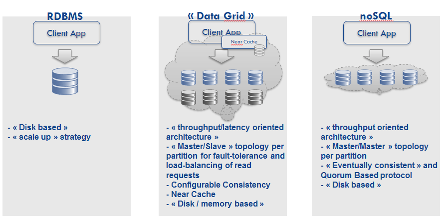 - Data grids enable near-cache topologies. The classical way of scaling readings with a RDBMS solution is to add a cache layer on top of the RDBMS (typically a memcached with difficulties like cache synchronization, cache partitioning to avoid collapsing the RDBMS in case of failure..). We do it so we know it works but data grids facilitates the deployment of "near cache topologies" - which means that data can be cached on the client side - ensuring the auto-eviction when the data is updated in the central storage, accelerating the readings...