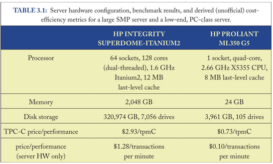 En somme, ce tableau compare le coût de la scalabilité horizontale et de la scalabilité verticale. Ainsi, la ligne “TPC-C price / performance” montre que le Proliant est 3 fois plus efficace (selon le ratio défini préalablement) que le Superdome. Ce ratio est encore plus important d’après la ligne “price/performance (server HW only)” qui retire de l’équation le coût du stockage et donc compare des “capacités de traitement”.