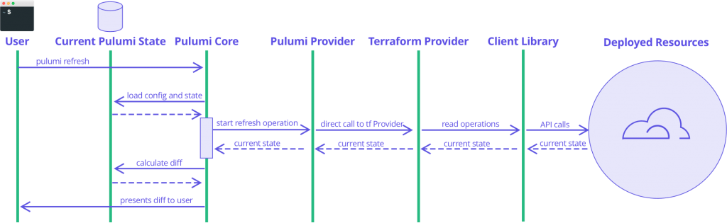 Dans le cadre d’un déploiement de ressources avec un Provider Pulumi basé sur un Provider Terraform (AWS, GCP, Azure, …), la séquence des opérations pour réaliser la commande pulumi refresh est vraiment proche de celle pour réaliser un terraform plan. Le schéma montre bien que le Provider Pulumi appelle directement celui de Terraform pour aller lire l’état actuel des ressources sur le cloud. C’est d’ailleurs le seul point de contact entre Terraform et Pulumi lors de l’exécution de la commande. L’état connu est bien celui qui est managé par l’engine de Pulumi et non pas l’état de Terraform. Il est nécessaire de préciser que Pulumi ne fait jamais appel au core de Terraform, le seul point de contact entre Pulumi et Terraform se trouve au niveau des Providers.