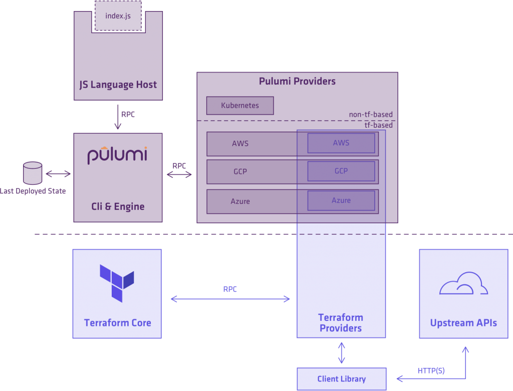 La principale différence entre Pulumi et Terraform réside dans le besoin d’exécution et de compréhension du programme décrivant l’infrastructure. Pour chaque langage supporté par Pulumi il existe donc un Language Host.