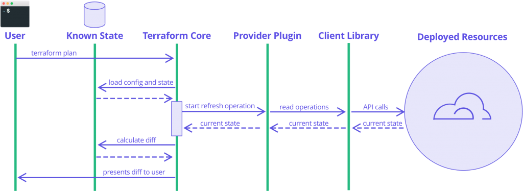 Un exemple typique des interactions entre les différentes briques composant Terraform est visualisable en prenant l’exemple de la commande terraform plan.