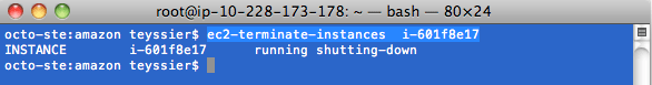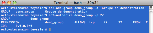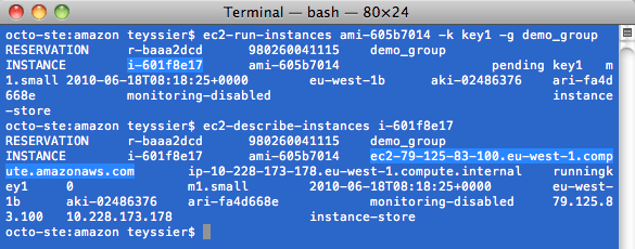 - La commande ec2-run-instances permet de lancer l’instance en précisant la clé et le groupe de sécurité à utiliser. La commande retourne entre autres l’identifiant de la machine virtuelle. Nous pouvons alors connaître l’état de l’instance grâce à ec2-describe-instances qui nous retourne son DNS public une fois qu’elle est lancée.