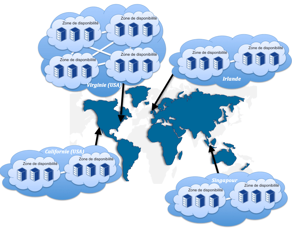 Contrairement à GOOGLE, AMAZON permet de définir l’emplacement géographique de certaines ressources. Pour cela, les concepts de régions et zones de disponibilités ont été introduits.  Une région est une zone géographique – Europe, Asie, Etats-Unis Est et Ouest– composée de plusieurs zones de disponibilités.  Les zones de disponibilités sont des emplacements distincts conçus pour ne pas être impactés par un dysfonctionnent d’une zone de disponibilité voisine. Néanmoins, les connexions entre les zones de disponibilités d’une même région sont optimisées pour fournir une faible latence.